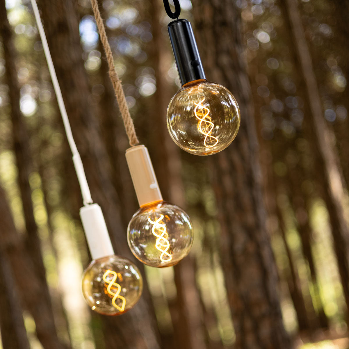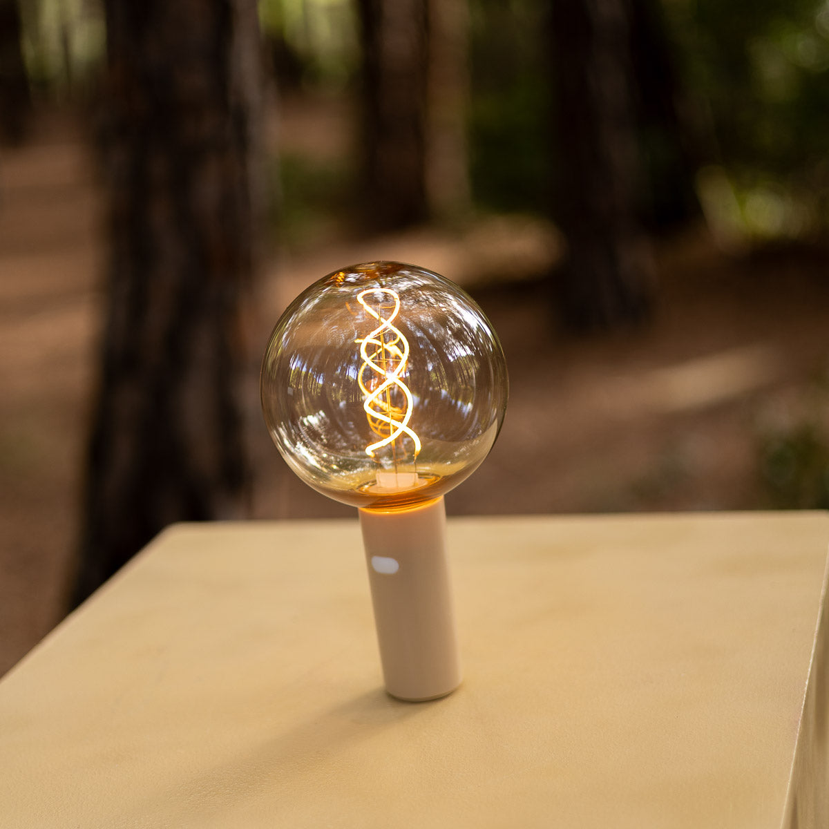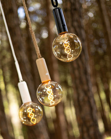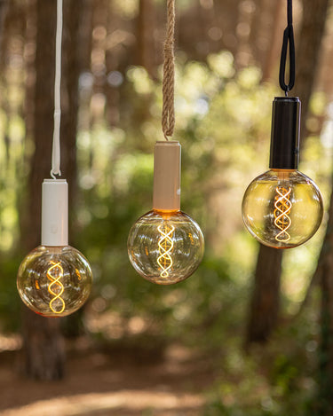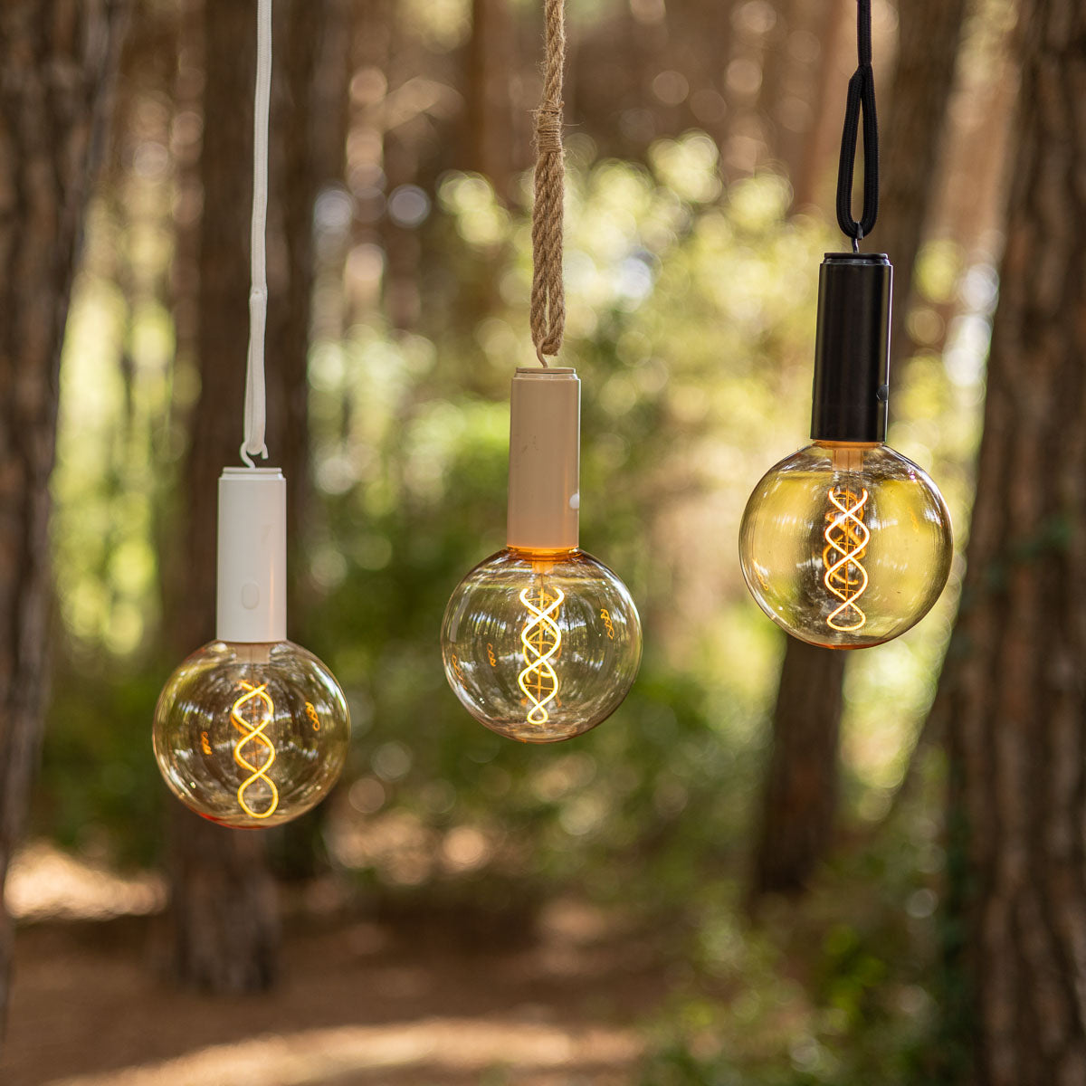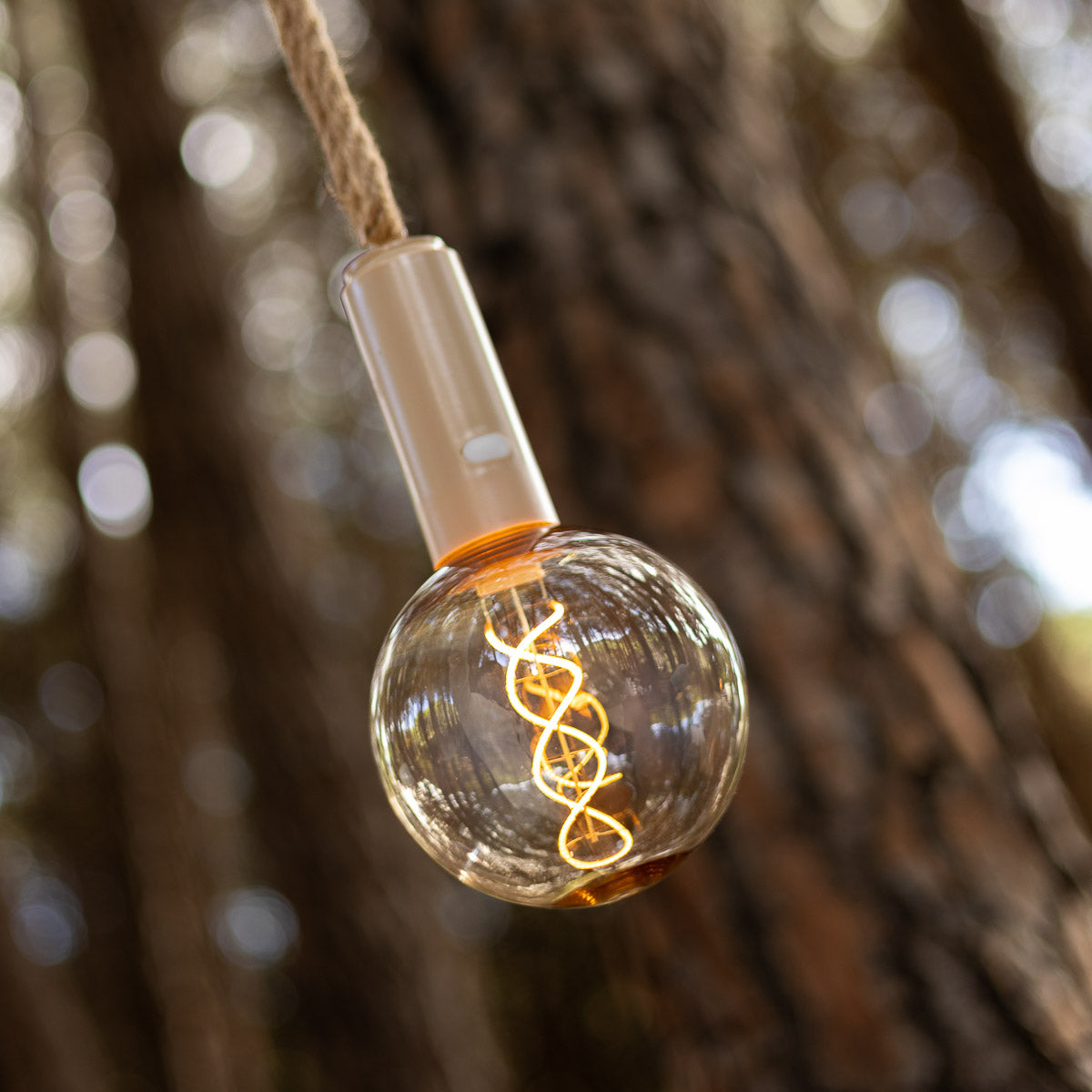 A lâmpada vintage portátil sem fio EDY G125 não requer instalação, basta pendurá-la ou aproximá-la de uma área metálica e ela aderirá devido à sua base magnética. Incorpora um filamento LED de alto brilho e o seu revestimento plástico que simula vidro fumado é altamente resistente, quase inquebrável. Inclui um gancho de metal para pendurar e uma corda de dois metros.