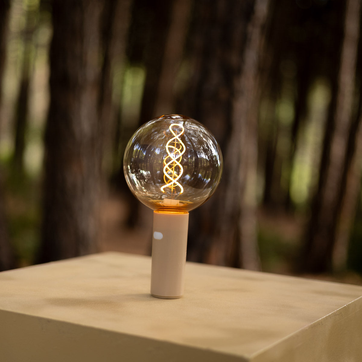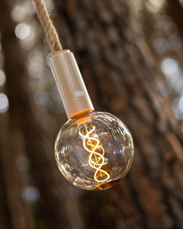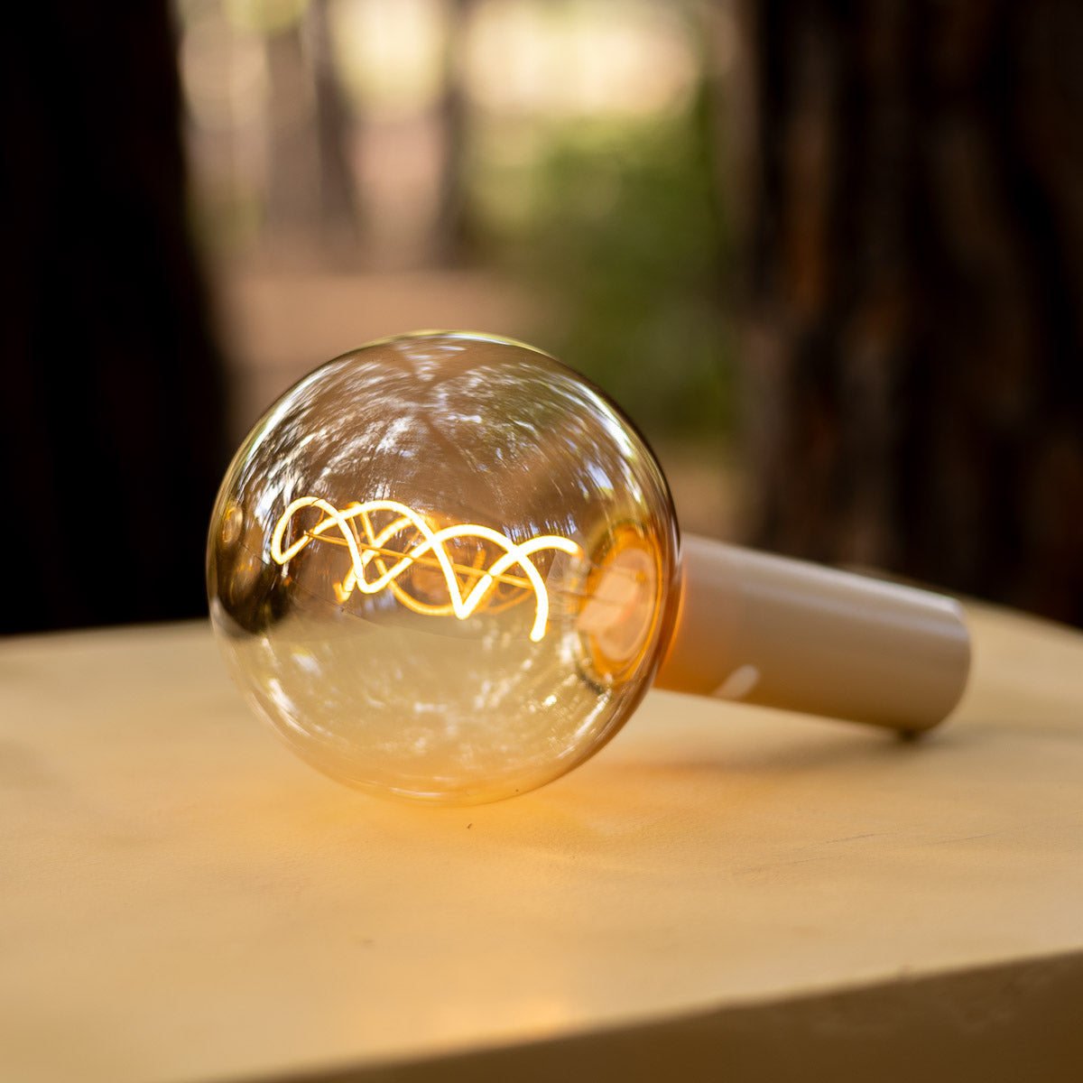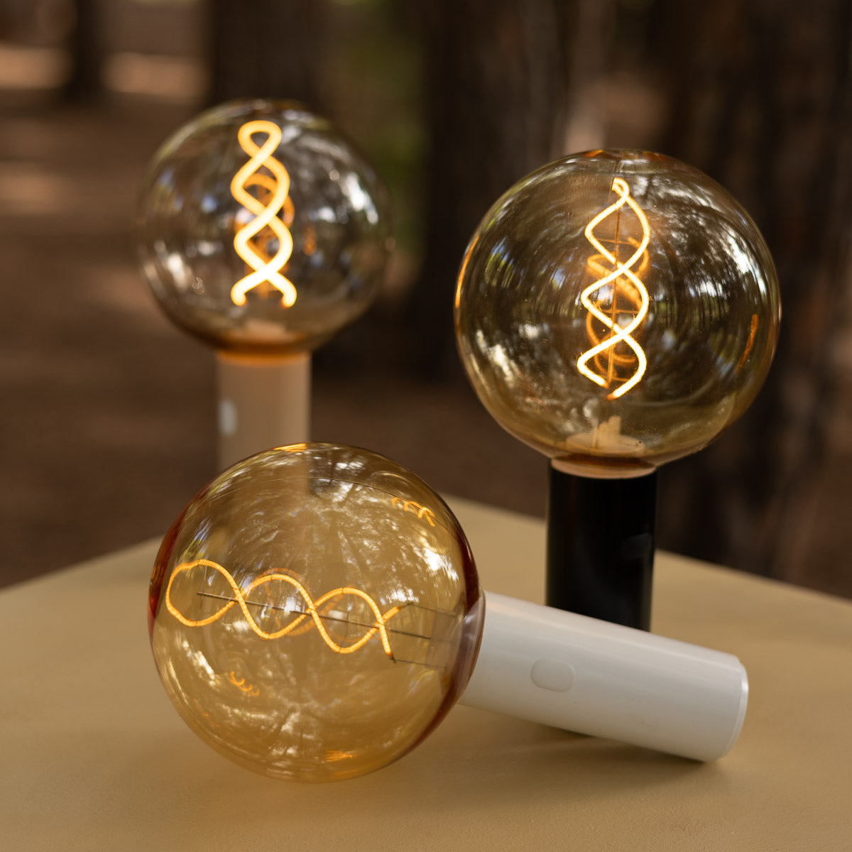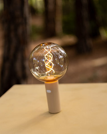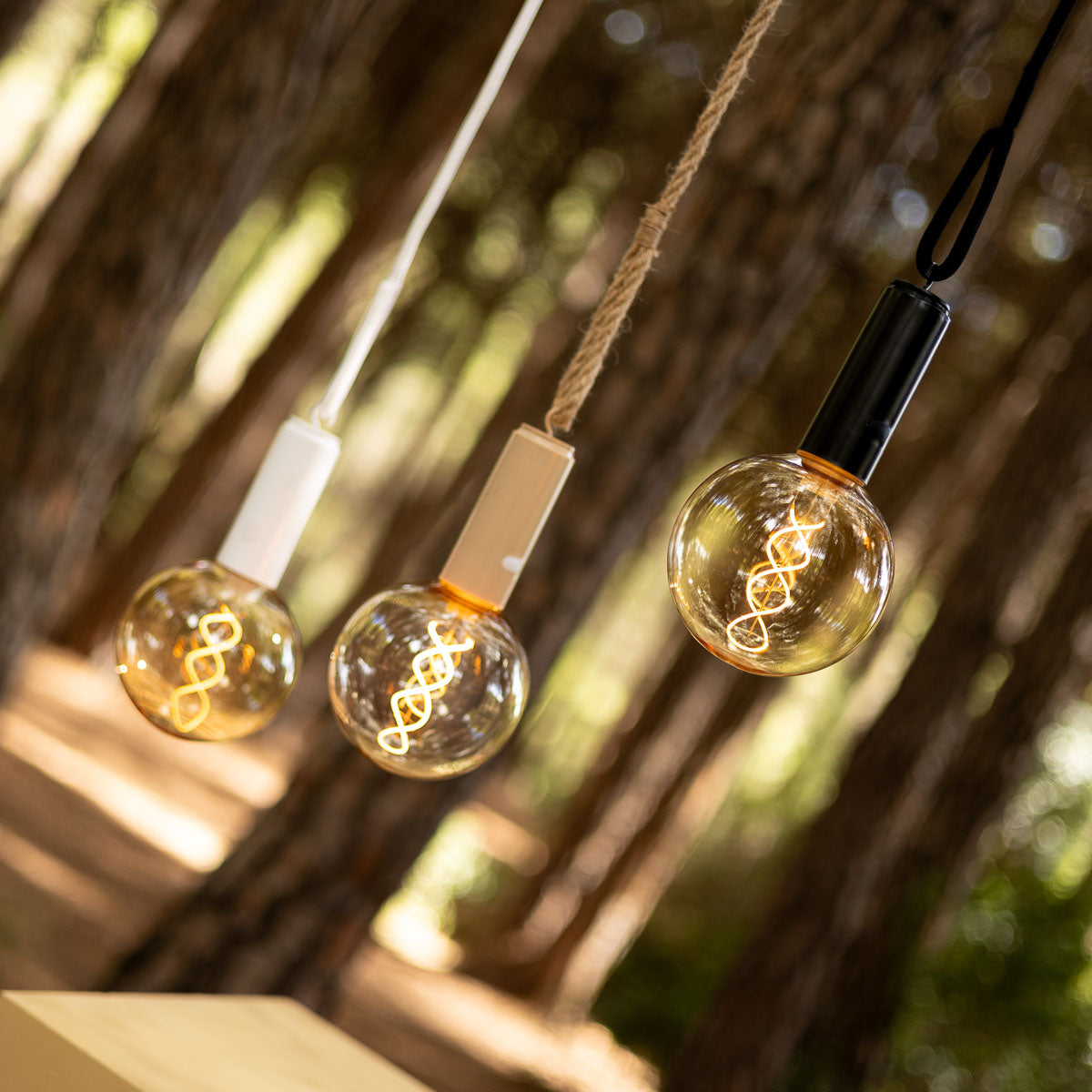A lâmpada vintage portátil sem fio EDY G125 não requer instalação, basta pendurá-la ou aproximá-la de uma área metálica e ela aderirá devido à sua base magnética. Incorpora um filamento LED de alto brilho e o seu revestimento plástico que simula vidro fumado é altamente resistente, quase inquebrável. Inclui um gancho de metal para pendurar e uma corda de dois metros.